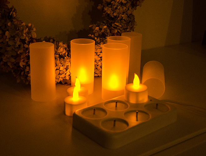 6 wiederaufladbare LED-Teelichter mit 6 Milchglas-Behältern und Ladestation